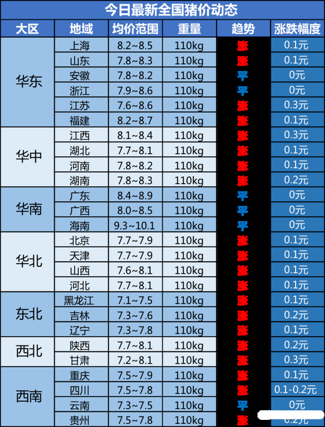 从猪价涨跌情况来看,今日猪价上涨的区域主要集中在华中,东北,西北地区以及华东局部地区。其中华中地区全线飘红,单日上涨0.1~0.3元/斤,外三元平均报价为7.7~8.4元/斤,紧随其后的是西北地区,单日上涨0.2~0.3元/斤,屠企报价7.2~8.1元/斤。