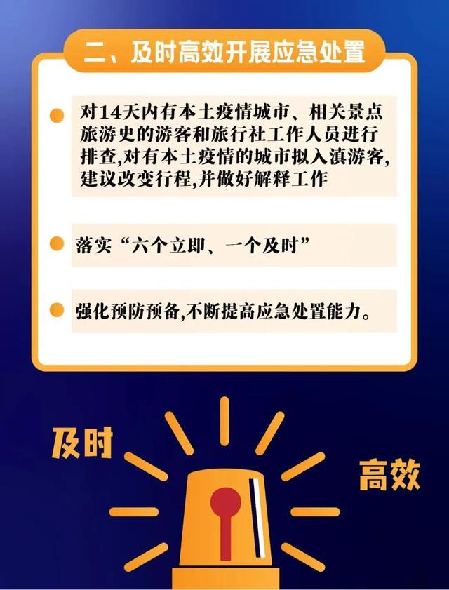 全省各级文化和旅游部门要按照省应对疫情工作领导小组指挥部办公室《关于加强对南京等地本土疫情涉及人员健康管理的紧急通知》要求,对14天内有本土疫情城市、相关景点旅游史的游客和旅行社工作人员进行排查,告知其主动向目前所在社区或单位报告,做好健康监测,并进行核酸检测;对有本土疫情的城市拟入滇游客,建议改变行程,并做好解释工作;要在当地党委、政府的统一领导下,落实“六个立即、一个及时”,配合做好发生疫情区域的精准封控管理及交通管制、限制人员聚集、停工停业等措施;要强化预防预备,不断提高应急处置能力。