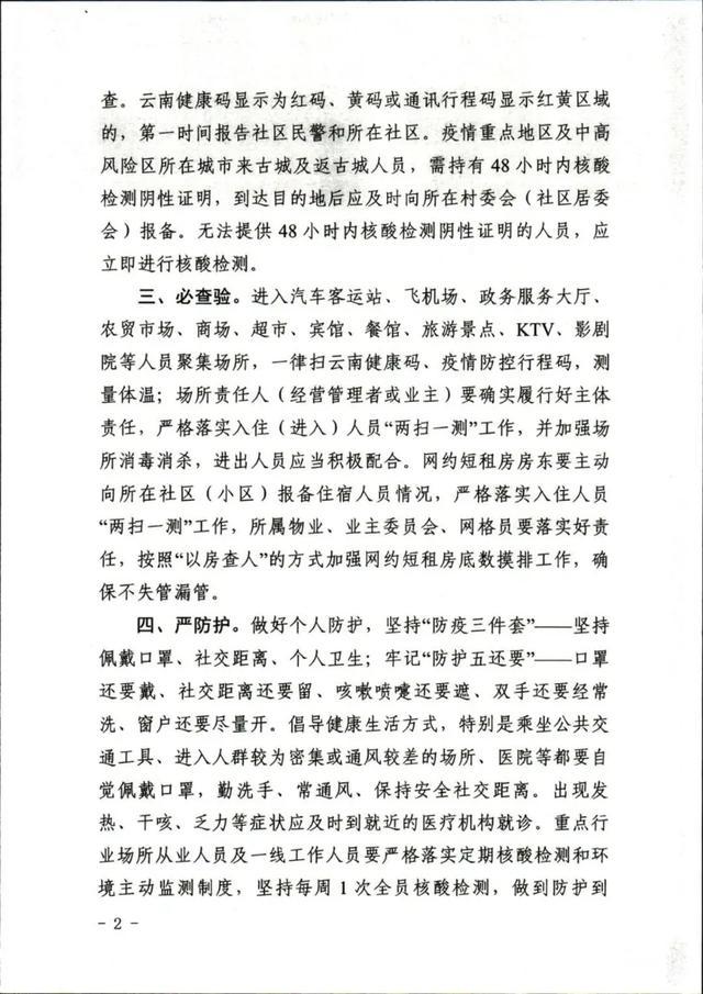 二、严格落实措施。各级党政机关、企事业单位、学校、医院、社区、景区、商场、超市、集贸市场、酒店宾馆、餐饮饭店等公共场所严格落实扫码验码、测量体温、科学规范佩戴口罩、日常清洁、通风消毒、保持1米安全社交距离等防控措施。