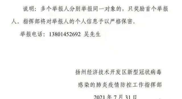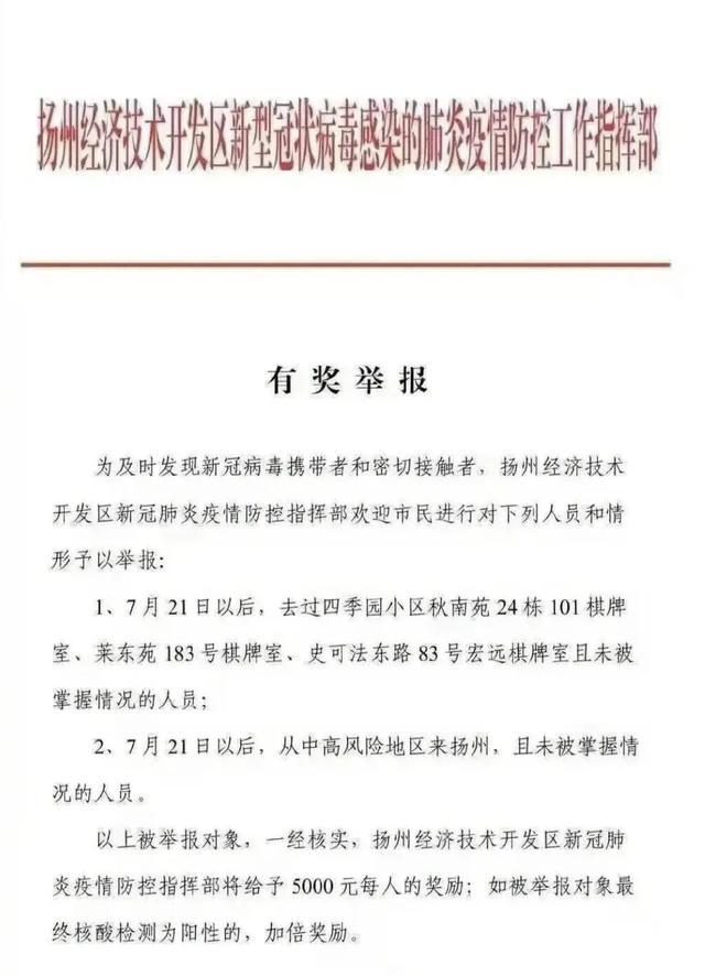 8月1日,江苏省扬州市经济技术开发区新型冠状病毒感染的肺炎疫情防控工作指挥部发布《有奖举报》称,为及时发现新冠病毒携带者和密切接触者,重奖寻涉疫相关人员。对举报和此次疫情相关的棋牌室人员,以及“从中高风险地区来扬州,且未被掌握情况的人员”,经核实无误的,给予5000元奖励,如被举报对象核酸检测为阳性的,加倍奖励。