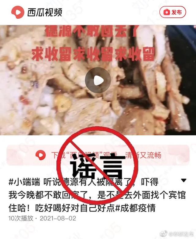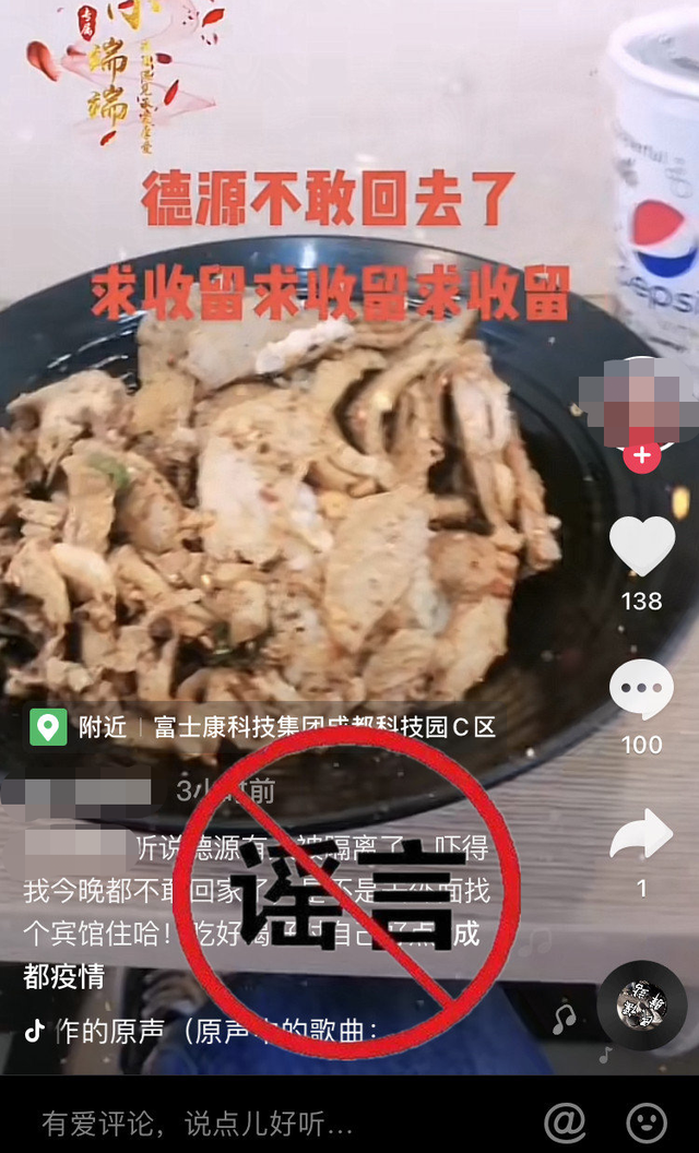8月2日,有网民在抖音等视频平台传播“郫都区德源街道疑似出现确诊病例”信息,视频配文称“德源有人被隔离”并附详细定位,引发部分网民恐慌情绪。