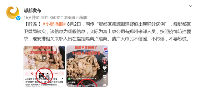 8月2日,郫都区通过官方微博@郫都发布辟谣称:经郫都区卫健局核实,该信息为虚假信息,实际为富士康公司有郑州来郫人员,按照疫情防控要求,现安排相关来郫人员在指定隔离点隔离。请广大市民不信谣、不传谣,不要恐慌。