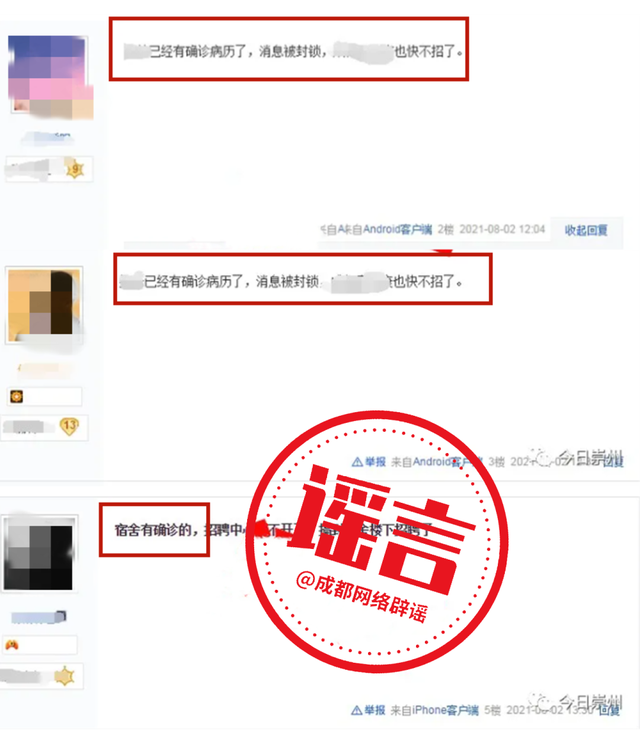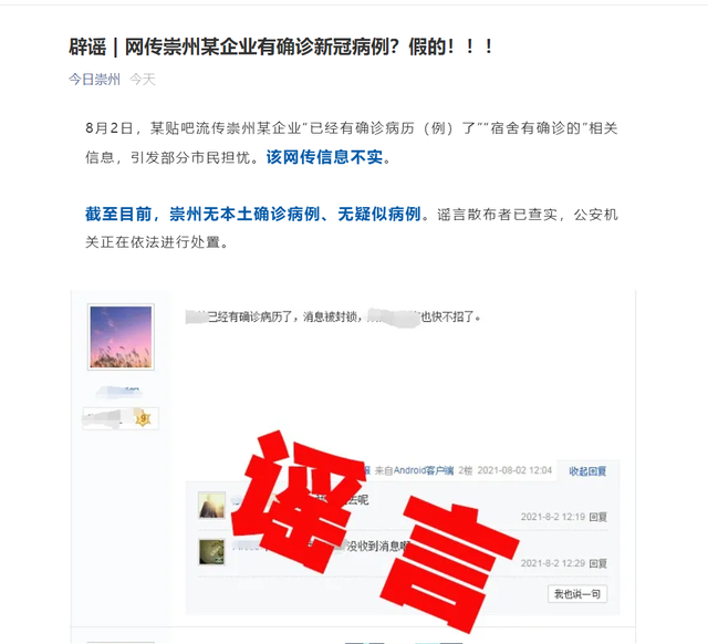 8月2日,个别网民在百度贴吧散布“崇州市某企业有确诊新冠病例”传言信息,内容称“崇州某企业已有确诊病例,消息被封锁”、“宿舍楼有确诊”,引发网民关注。
