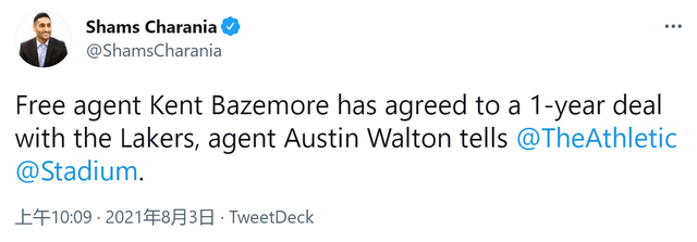 根据名记Shams报道,在接连签约三名旧将,湖人又签下一名旧将贝兹莫尔。