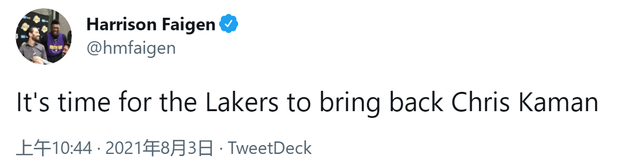 另外一名随队记者Harrison Faigen也公开调侃湖人,表示:“是时候把克里斯-卡曼签回来了。”