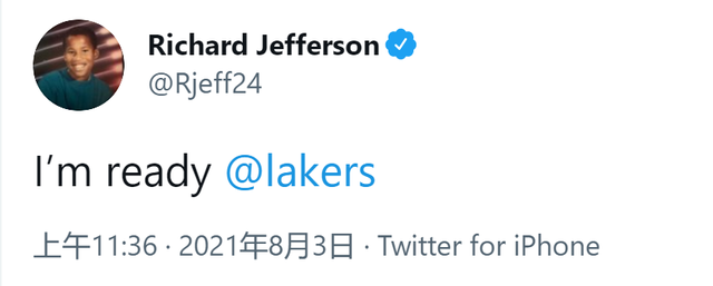 其中理查德-杰弗森公开表示:“我准备好了@湖人”,41岁的理查德-杰弗森目前已经退役3年之久。