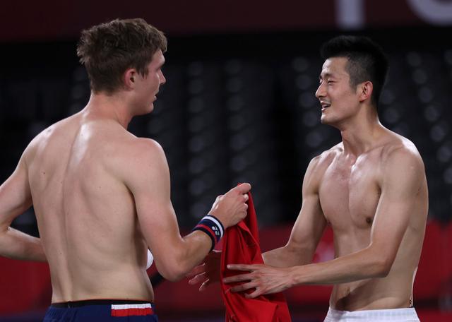 8月2日,羽毛球男子单打决赛后,谌龙(右)和丹麦的安赛龙交换球衣。新华社记者 欧东衢 摄