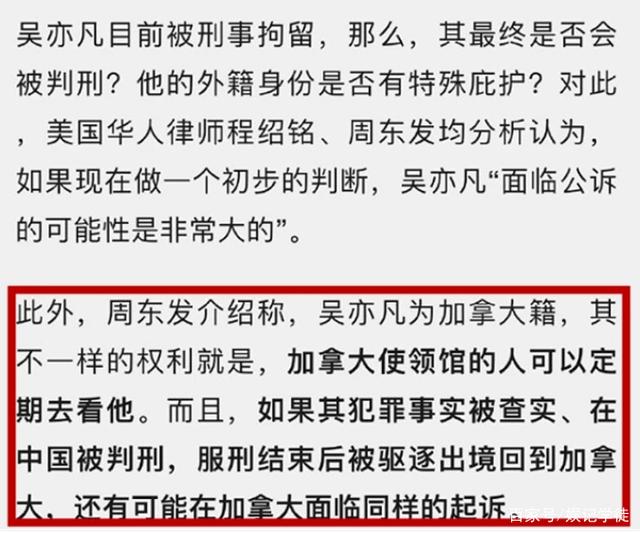 有不少律师分析表示,加拿大国籍的吴亦凡除了受到中国法律的约束之外,在服刑完毕之后还要被驱逐出境,甚至在罪行坐实之后,回到加拿大的吴亦凡可能还要面临更严重的刑期。