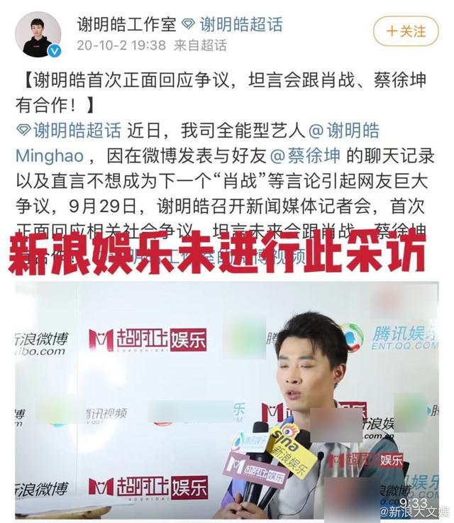 作为一个并不太知名的十八线艺人,谢明皓曾做过碰瓷肖战、蔡徐坤的事,也还曾自己给自己P图接受新浪娱乐专访却被对方辟谣的情况。
