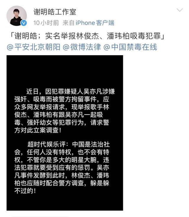 但辟谣还没有过去,艺人歌手谢明皓就借此机会突然在社交平台上发文,称自己实名举报林俊杰、潘玮柏的犯罪行为。