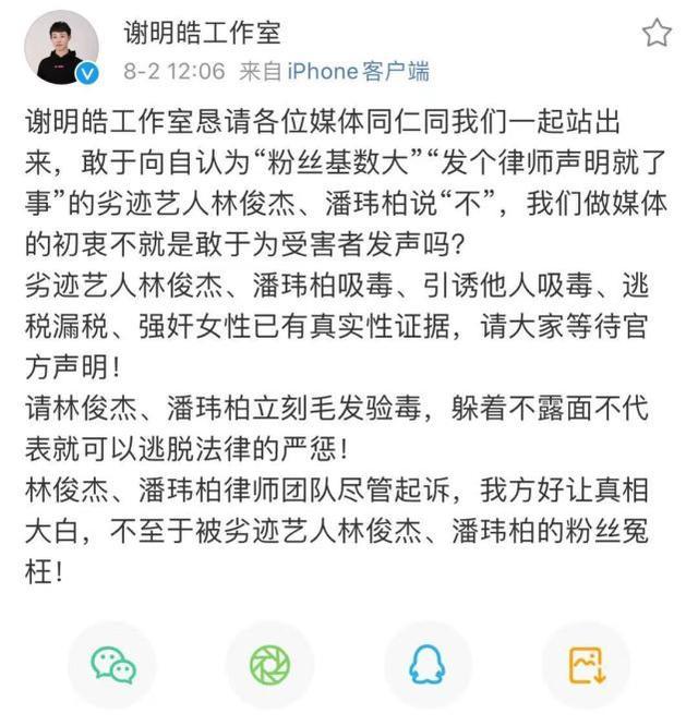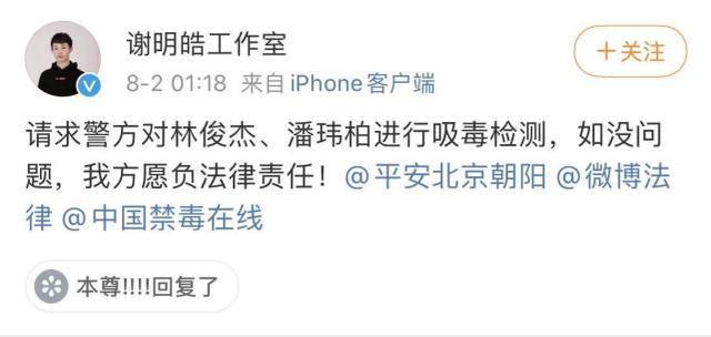 面对网友们的质疑,谢明皓这次没有怂,而是追发博文表示愿意负法律责任,请求相关部门严查。网友们也由此开始了大规模对潘玮柏和林俊杰的猜测,并希望两人证明自己。