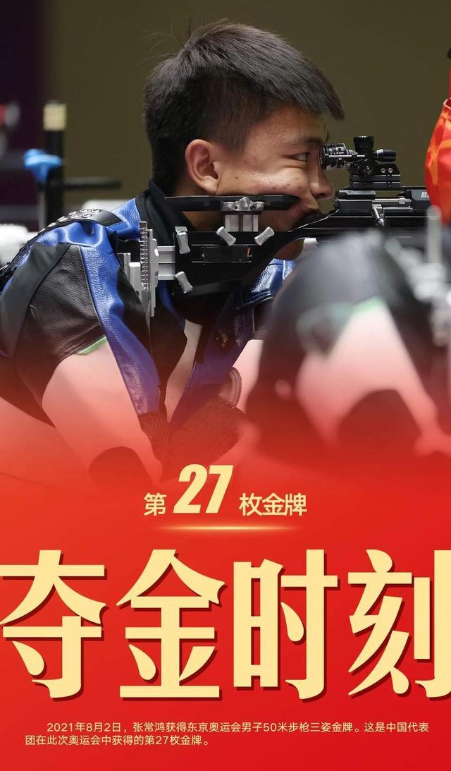 中国“00后”小将张常鸿夺得了东京奥运会男子50m步枪3姿金牌,然后创造了新的决赛世界记录,这是中国代表团在本届奥运会上获得的第27枚金牌。