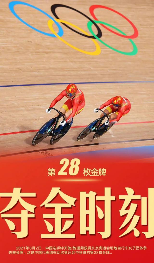 2021年8月2日,中国的钟天使、鲍珊菊以31秒895的成绩领先东京奥运会会场的自行车女子团体获得金牌,这是中国代表团在本届奥运会上获得的第28枚金牌。