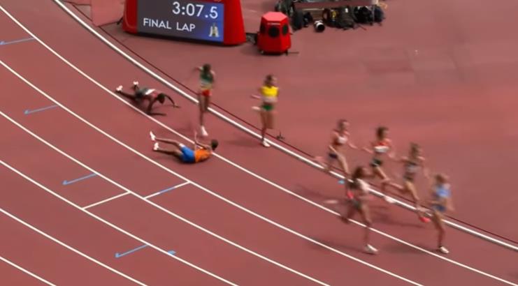 哈桑(橙色上衣)在1500米最后一圈摔倒。视频截图