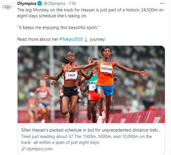 “实力越强,责任越大。”东京奥运会上,哈桑绝对是最“累”的运动员之一。国际奥委会官网发文称,本届奥运会哈桑报名了1500米、5000米和10000米3个项目,如果她最终都能晋级决赛,那么她就将整整跑24500米(1500米3枪、5000米2枪、10000米1枪)!根据赛程,哈桑的下一次出场是在北京时间8月4日晚的1500米半决赛。