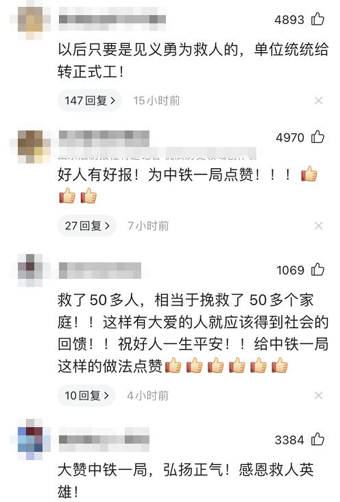此事一经报道,引起网友们的关注,有网友称,救了50多个人,相当于救了50多个家庭啊,这样有大爱的人就应该得到社会的回馈,祝好人一生平安,为其工作单位点赞。还有网友表示,在危难关头能挺身而出的人都是善良、有责任感的人,这种品质不论放到什么工作岗位上都会让领导放心,英雄值得!