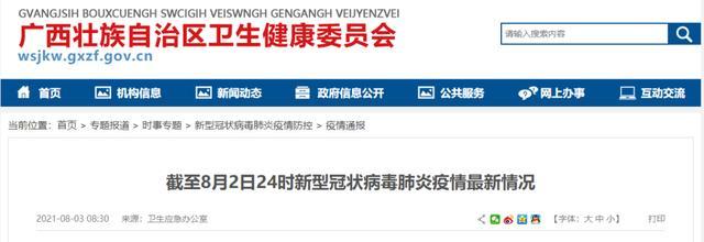 8月2日0至24时,广西无新增本土确诊病例、疑似病例和无症状感染者。今日新增密切接触者11人。现有境外输入确诊病例2例,现有境外输入无症状感染者5例,现有密切接触者87人。