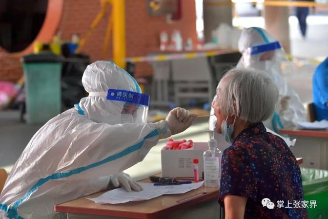 时间:日前,慈利县医疗队员到永定区进行医疗支援,对枫香岗街道居民进行核酸检测。穿着防护服的他们,汗水浸湿了衣衫。