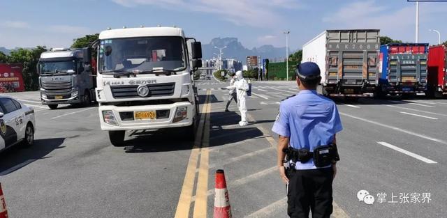 时间:8月1日,张家界高速东阳湖坪出口,一线防疫人员对过往车辆进行消杀,高速交警对过往车辆进行秩序维护。(陈启智 摄)
