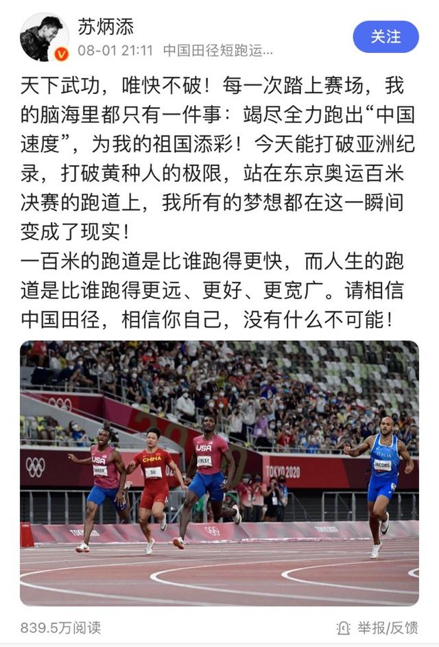 苏炳添发文