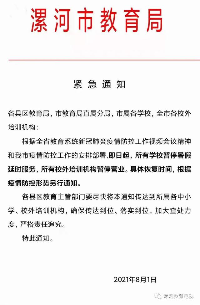 根据全省教育系统新冠肺炎疫情防控工作视频会议精神和我市疫情防控工作的安排部署,即日起,所有学校暂停暑假延时服务,所有校外培训机构暂停营业。具体恢复时间,根据疫情防控形势另行通知。