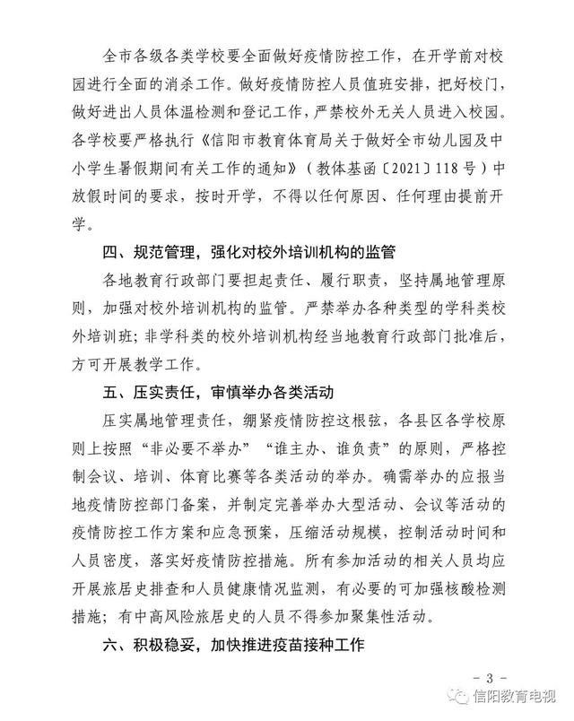 一是立即启动疫情应急机制。各地各学校要按照教 体系统疫情防控前期通知有关要求,履行属地管理责任,立即激活疫情应急指挥体系,启动应急处置机制;二是严格活动管控。即日起,暑假托管服务一律暂停;各学校一律不得安排学生返校,已经安排返校的,立即停止校内活动,做好师生的思想工作,确保平安离校;校园实行封闭管理,校外无关人员一律不准进入学校;校外培训机构线下培训一律暂停;教师到外地培训活动一律取消;所有在办各类体育赛事活动一律暂停,所有计划举办的各类体育赛事活动一律推迟举办。其他事宜另行通知。三是严格教职员工和学生管理;四是继续抓好覆盖全员的健康监测和外出请假报备制度。