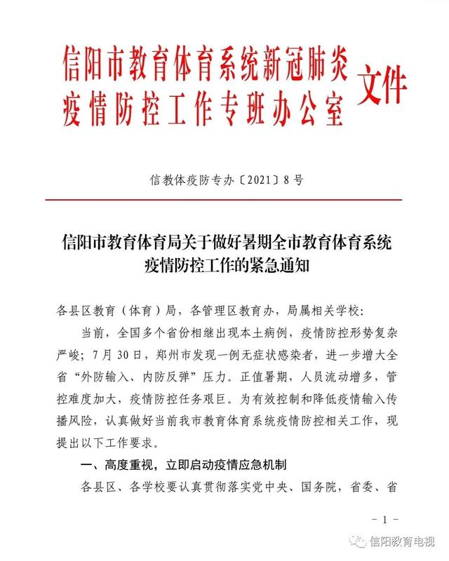 当前,全国多个省份相继出现本土病例,疫情呈现快速蔓延趋势,防控形势异常复杂严峻。7 月 30 日,我省郑州市发现多例无症状感染病例,进一步增大全省“外防输入、内防反弹”压力。正值暑期,人员流动增多,管控难度加大,教育系统疫情防控任务艰巨。为迅速贯彻落实 7 月 31 日全省全市新冠肺炎疫情防控工作电视电话会议精神,有效控制和降低教育系统疫情输入传播风险,扎实做好当前全市教育系统疫情防控工作,现就有关事项紧急通知如下: