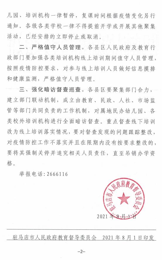 近日,驻马店市人民政府教育督导委员会要求从2021年8月1日起,全面暂停全市所有校外培训机构及学校、幼儿园的暑假相关活动。有效控制全市教育系统疫情输入的传播风险,认真做好当前疫情防控的相关工作。具体文件内容如下: