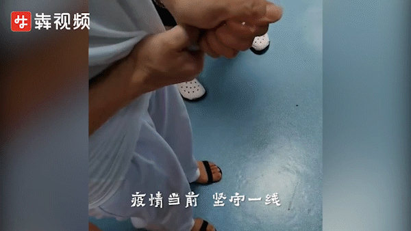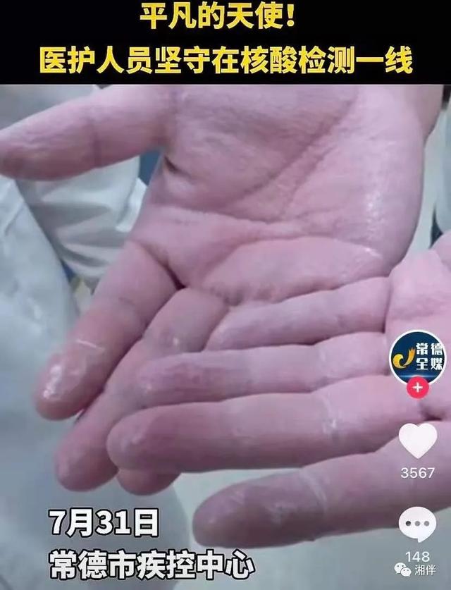 由于穿着厚厚的防护服连续工作,汗水将医护人员的双手浸泡得发白起皱。