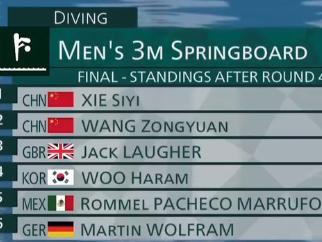 比赛来到第三跳,王宗源向前翻腾两周半,转体三周,但是入水时有些过了,但是起跳高度非常有力,反超了英国选手。谢思埸第三跳水花有些大,但是依旧拿到86.4分,以267.30分位居第一,王宗源256.50分第二。王宗源第四跳,水花稍微大了一点,但是还是拿到84分,谢思埸起跳,向后翻转三周半,非常漂亮的一跳,各个环节堪称完美!拿到94.50的高分!谢思埸以361.80分高居第一,王宗源340.50分位居第二!
