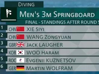 比赛来到第五跳,埃及选手险些擦板,只拿到50.75分,美国选手压制水花很不错,但是没有能够很好地完成动作,导致入水时有些偏差。俄罗斯选手的一跳表现非常完美,拿到92.75的高分!王宗源上场,向后翻腾三周半抱膝,拿到91.80分的高分,谢思埸登场,向内翻腾三周半,直接拿到94.35的高分,总分456.15分高居第一王宗源432.30分位居第二!目前优势非常明显!