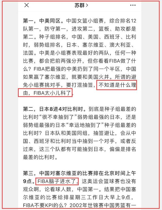 而苏群在看到抽签结果后,就特意发文怒斥国际篮联和东道主太过分,苏群表示:“我从来就不信抽签啥的,你瞧瞧这都什么呀!”随后他指出本次抽签和赛程安排3点让其不满的地方: