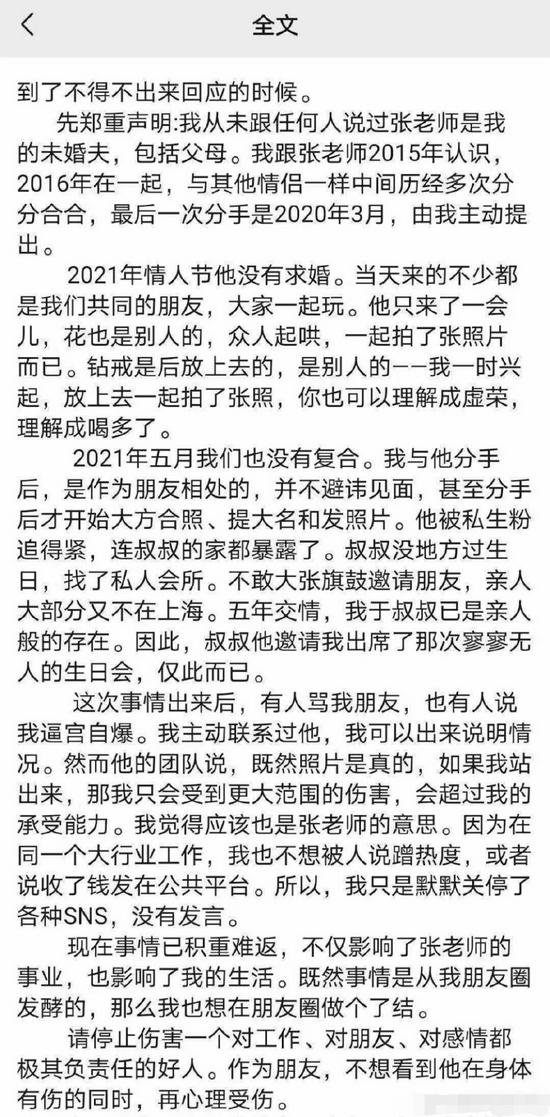 新浪娱乐讯 8月2日,疑似王佩雯回应与张哲瀚[微博]的恋情传闻的截图流出。王佩雯在朋友圈称与张哲瀚2016年在一起,2020年3月已经分手,并强调从未说过张哲瀚是她的未婚夫。此外,她解释了网传照片,否认2021年情人节张哲瀚求婚,称只是朋友起哄,花和戒指都是别人的。对于2021年5月的私人会所生日照,她称是以朋友的身份出席的生日会。