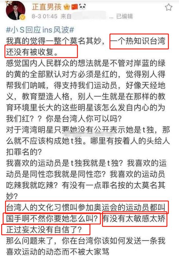 8月3日凌晨,该艺人做出了一些小SINS风波的看法,在其中直言表示台湾人都叫奥运会选手为“国手”,所以不能由此判定小S就是台独。