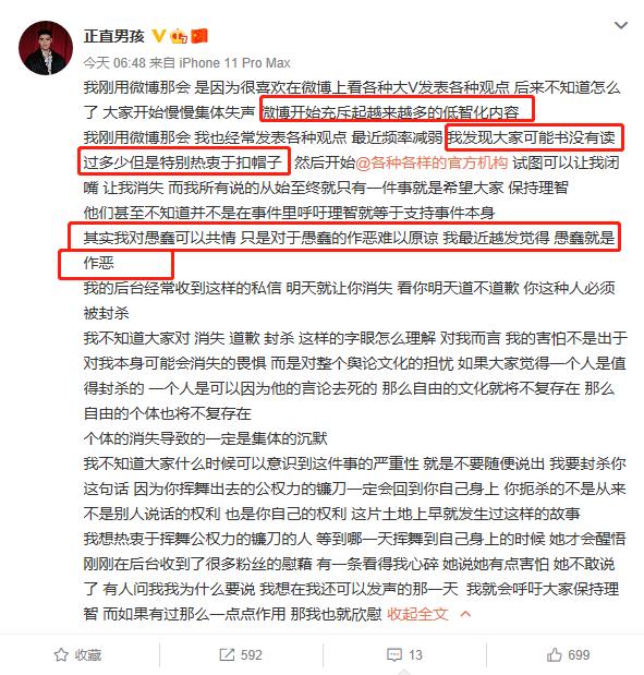 可能因为言辞不当,该艺人后面已经删除了之前的言论,随后在早上6点多时,又重新发表了一篇言论。