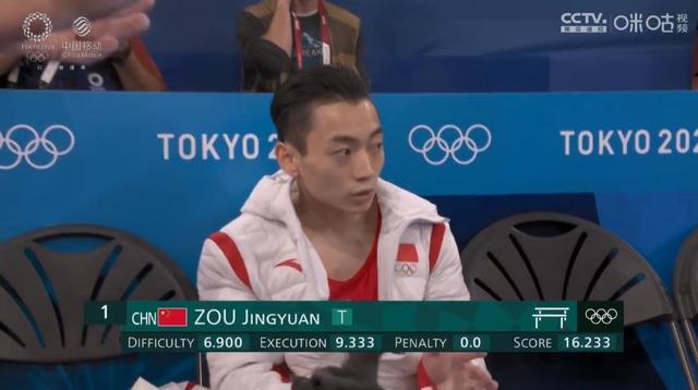比赛开始邹敬园第二个上场,他是两届世锦赛双杠冠军得主。发挥稳定,倒立笔直,落地站住,难度分6.900,完成分9.333,总16.233分相当炸裂,超过了他在预赛中的成绩,有望冲金。