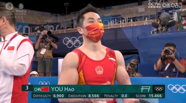 尤浩第四个上阵,昨日吊环拿到亚军。翻腾很顺利,落地时候小小跳了一下没站住,最终难度6.900分,完成8.566分,总15.466分,暂列第三,没能超过第一个上场的土耳其选手!29岁的老将了,很不容易。