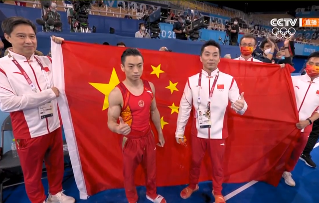最终,邹敬园从第二个出场坐稳第一后,一路领跑,强势夺冠,等最后一名选手成绩出来之后,低于自己,这样一来,邹敬园成功拿下金牌,但他非常淡定,中国体操队拿出国旗,霸气庆祝,邹敬园和队友尤浩站在国旗前面,竖起大拇指,内心早已澎湃了!