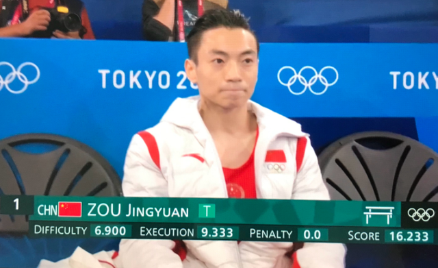 回到比赛,第一个出战的土耳其选手完成动作,拿到了15.633分,算是给双杠决赛打下了一个基础线,随后邹敬园出场,动作干净利落,几乎没有失误,难度分6.9,最终拿到9.333,总分16.233,非常惊艳,这个分数站上领奖台板上钉钉,就看后面选手能否超越了。