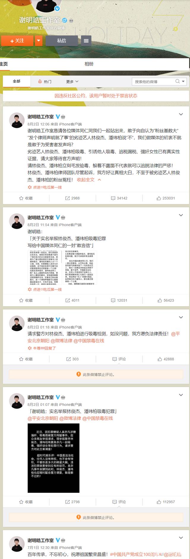 但就在“谢明皓工作室”连发四条微博,观众都兴致勃勃的等待进一步大瓜时,其工作室社交平台被禁言了。