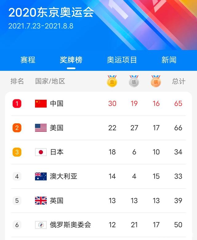 中国30枚金牌占据东京奥运会奖牌首位作者@辉心之旅
