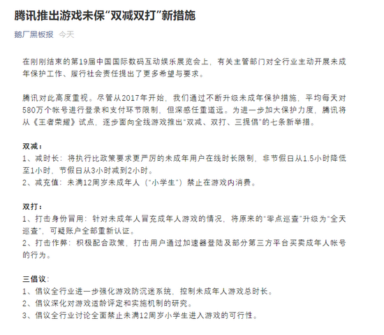 另一方面,腾讯公司在午间迅速发文,据“ 鹅厂黑板报”微信公众号8月3日消息,为进一步加大保护力度,腾讯将从《王者荣耀》试点,逐步面向全线游戏推出“双减、双打、三提倡”的七条新举措。