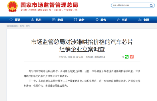 8月3日消息,市场监管总局发公告称,针对汽车芯片市场哄抬炒作、价格高企等突出问题,近日,市场监管总局根据价格监测和举报线索,对涉嫌哄抬价格的汽车芯片经销企业立案调查。下一步,市场监管总局将持续关注芯片等重要商品市场价格秩序,进一步加大监管执法力度,严厉查处囤积居奇、哄抬价格、串通涨价等违法行为。