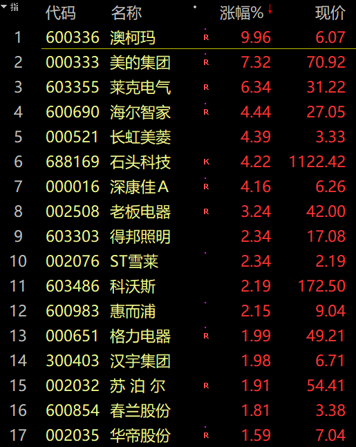 美的集团涨逾8%,石头科技涨近5%,深康佳A、海尔智家、格力电器等跟涨。