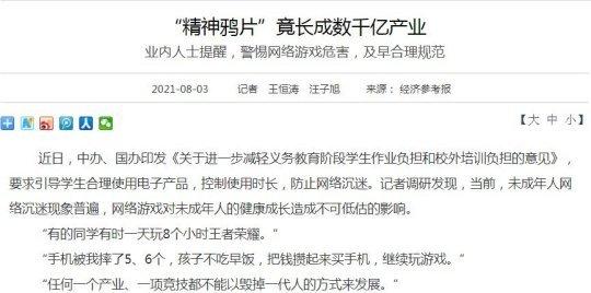 官方并明确刊发出了:『“精神鸦片”竟长成数千亿产业』、『“任何一个产业、一项竞技都不能以毁掉一代人的方式来发展”』发人深省的主副标题。但目前新华网相关文章显示“已删除或过期”。