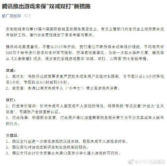 随后又通过腾讯游戏、《王者荣耀》等官博,正式对外公布了『腾讯推出游戏未保“双减双打”新措施』的详细公告,提出将将从王者荣耀试点,逐步向全线游戏推出:“双减(减时长、减充值)、双打(打击身份冒用、打击作弊)、三倡议”的七条新举措。包括将未成年用户在线时长限制,从非节假日1.5小时降至1小时,节假日从3小时减到2小时;未满12周岁未成年人(“小学生”)禁止在游戏内消费等。