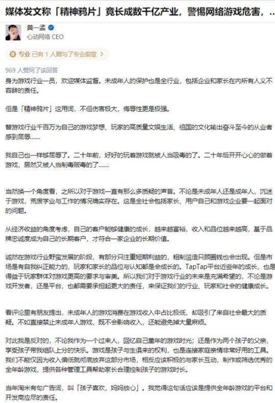 心动网络CEO黄一孟就今天“经济参考报称网络游戏为精神鸦片” 一事作出回应,他表示不但伤害极大,侮辱性更是极强。并提出游戏行业在追求经济利润的同时,还要肩负起对整个业界、整个社会的责任,同时也对直接禁止未成年人玩游戏这一提议表示反对。