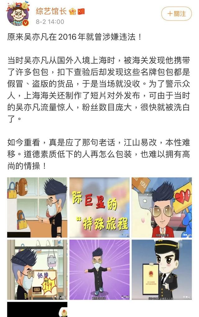 有微博网友爆出,在2016年吴亦凡当时从国外入境上海时,被海关查验后发现携带假的名牌包包、盗版的货品,准备卖给粉丝,于是当场就被没收。为了警示众人,上海海关还做了短片对外发布,可是由于当时的吴亦凡流量惊人,粉丝数庞大,很快就被洗白了。如今又知法犯法,酿下大祸。
