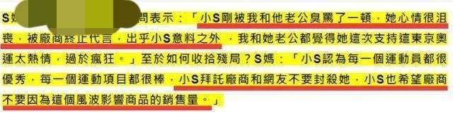 不过,小s妈妈的回应却是求生欲很强,她妈妈表示,小S被自己和老公狠狠臭骂了一顿,小S妈表示每位运动员都很优秀,每一个运动项目都很棒。同时小S妈还对媒体说:“小S拜托厂商和网友不要封杀她,同时小S也希望厂商不要因为这个风波影响商品的销售量”。
