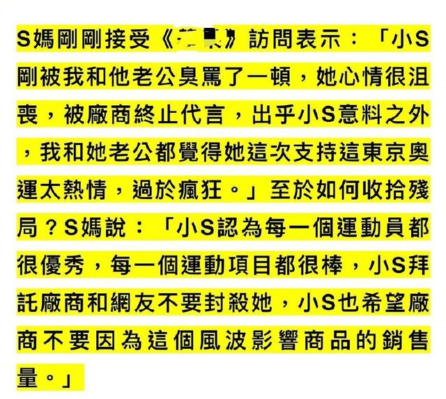 后来,还是由女方的妈妈发声,透露我们已经把小S痛骂了一顿,她自己也非常的伤心,只不过是太过于热衷奥运会了而已,希望自己的行为不会影响到品牌方的销量,也希望品牌方不要封杀她。可尽管如此,还是没有对于这种不当行为进行道歉。